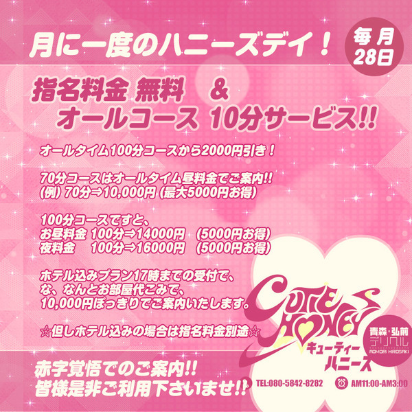 本日指名料金無料&全コース10分プラス (3000円お得!) 【ALL TIME 】 70分コースはALL TIMEお昼料金でご案内! 100分コースですと |
